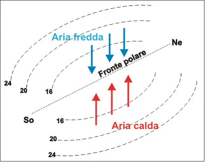 Si avranno variazioni brusche di temperatura e di umidità in una fascia di spazio molto ristretta. Questo stato di cose non può durare indefinitamente: due eserciti nemici schierati di fronte non tarderanno ad ingaggiare battaglia. Fu proprio questa analogia bellica che suggerì agli studiosi norvegesi di dare il nome di Fronte Polare alla linea di demarcazione al suolo fra le masse di aria di origine polare e le masse di aria di origine tropicale.