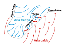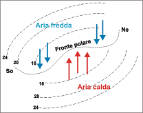 Nel capito riguardante la circolazione generale dell'atmosfera abbiamo visto come nelle grandi invasioni di aria fredda verso più basse latitudini e di aria calda verso quelle alte, vengano a scorrere, affiancate, masse di aria calda e masse di aria fredda. Che cosa avviene lungo la superficie (o discontinuità) che separa le due masse di aria?